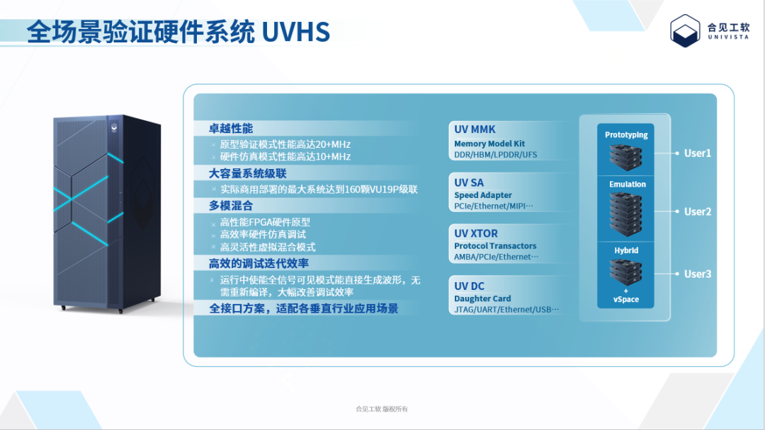 从本质上来说,这或是一个既要又要还要的问题。曹梦侠认为,在此情形下,理想的情况是将上述Emulation和Prototyping工具整合到一个单一平台之中合成统一流程,合见工软为此打造了全新商用级、高性能、全场景验证硬件系统UniVista Unified Verification Hardware System(UVHS)。