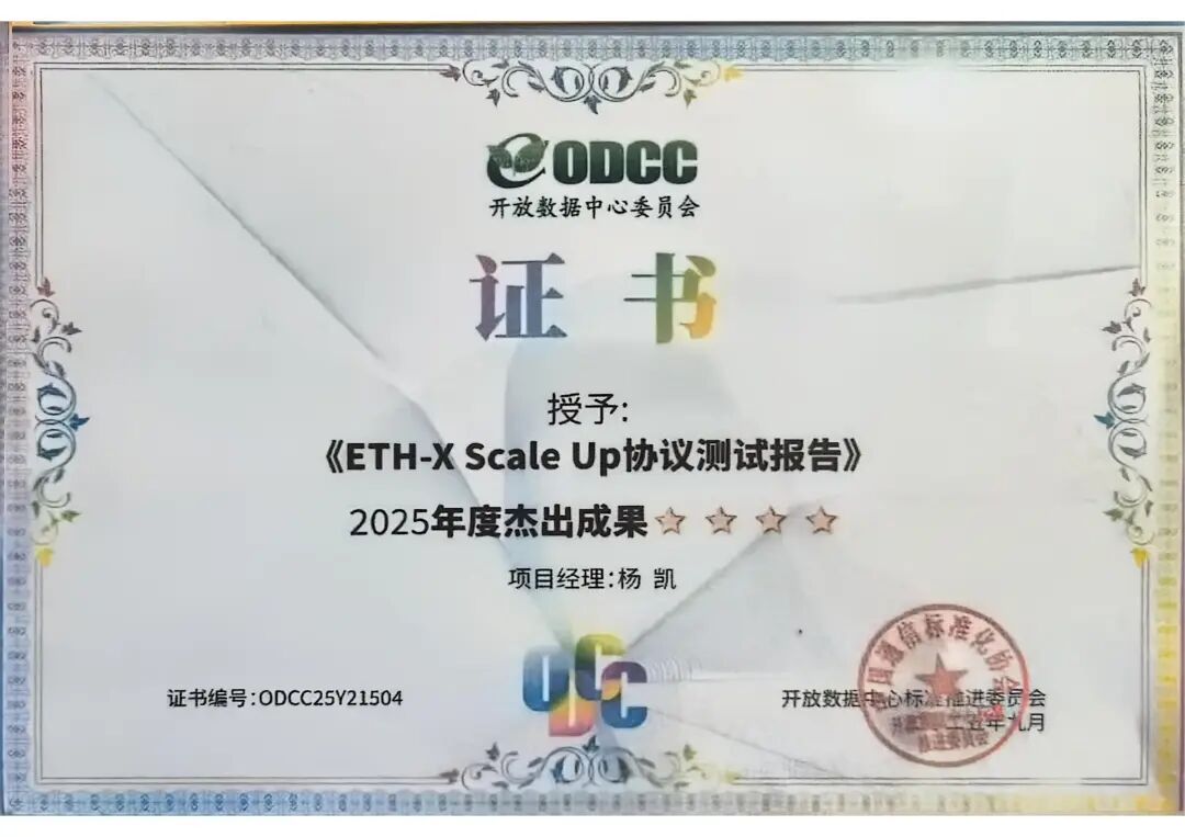 在2025年9月举办的ODCC年会上,合见工软发布了首份AI网络联合实验室针对ETH-X scale-up协议组网的测试报告,这一重要成果在会上获得了业界高度认可,并被开放数据中心标准推进委员会授予“2025年度杰出成果证书”,标志着合见工软在国内高性能AI网络领域的突破性进展。