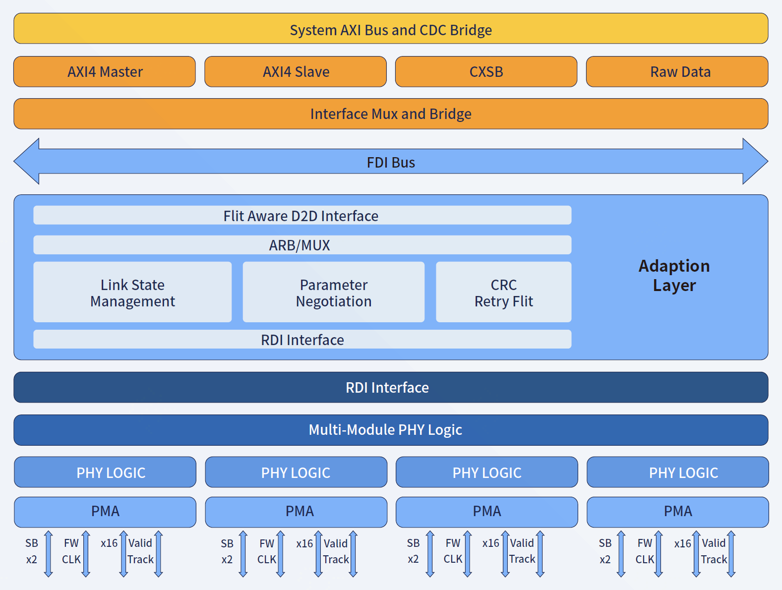 - 灵活的配置选项:可配置的通道插入损耗,标准封装最长支持50 mm;可编程链路初始化和训练,采用嵌入式处理器,支持标准版本升级;可选CXS.B、AXI接口或UCIe FDI接口